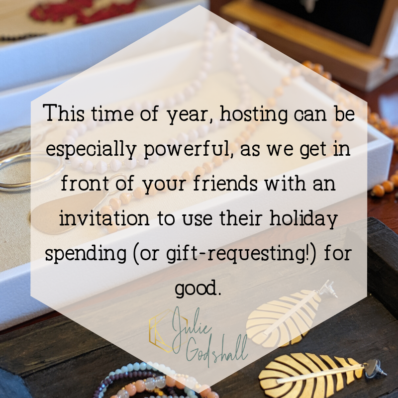 This time of year, hosting can be especially powerful, as we get in front of your friends with an invitation to use their holiday spending (or gift-requesting!) for good.
